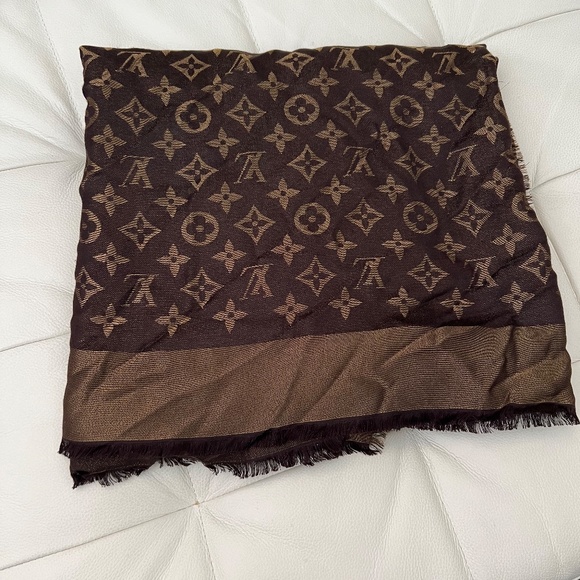 Rare Find! LV classic monogram metallic gold and brown Shawl/scarf with gold border and small fringe. Beautiful, and gently worn. Probably could use an iron ;-)