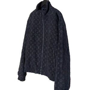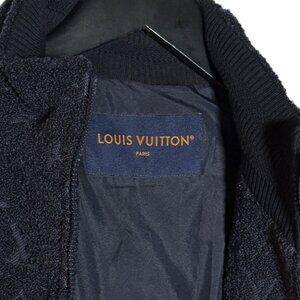 From the 2024 collection. Designed with an allover Monogram bouclette texture in navy blue. Features a front zip closure with oversized semi transparent and navy LV pull tab, side slit pockets, and ribbed stand collar, cuffs, and hem. Elastic waist. Fully lined interior in tonal fabric. Regular fit. Made in Italy. Comes with original Louis Vuitton tag, packaging, and invoice.
