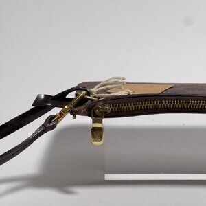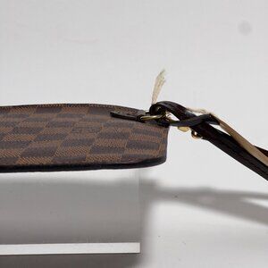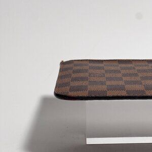 This Louis Vuitton Neverfull Pochette Pouch features the classic Damier Ebene canvas, characterized by its iconic brown and tan checkered pattern. The pouch comes with a gold-tone zipper closure and a detachable leather wristlet strap, allowing it to be used as a clutch or an organizer within a larger bag. The interior is lined in cherry and includes a small flat pocket for organizing essentials.