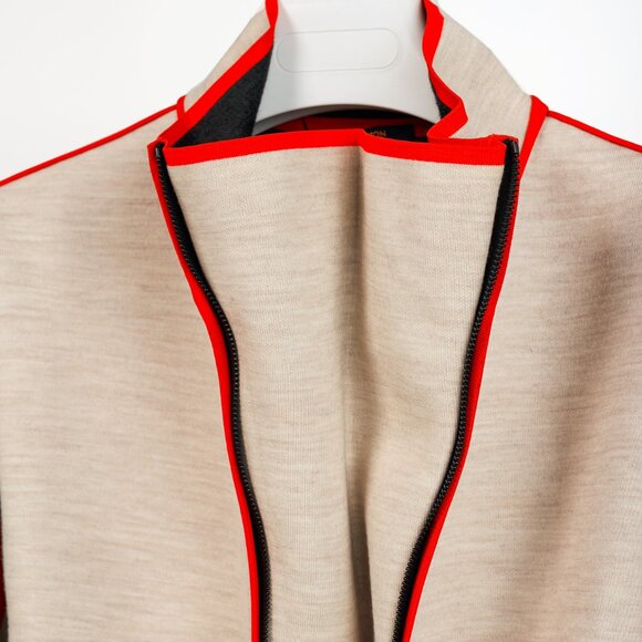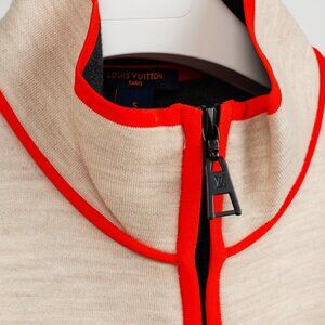 Made in Italy, this pullover from Louis Vuitton's Flight Mode capsule collection circa 2022 is crafted with a soft blend of wool, cashmere, and silk in an Off-White; and is elevated with a vivid orange trim throughout. It features long sleeves with iconic Monogram accents, colour-blocked cuffs, a mock neck, a front zipper, and a relaxed fit throughout the body.