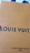 Elegant orange gift bag featuring bold blue handles. Iconic Louis Vuitton branding.
