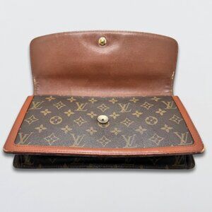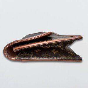 This vintage Louis Vuitton Pochette Dame clutch showcases the iconic monogram canvas with classic brown leather trim. Designed with a fold-over snap closure and a spacious interior, it's perfect for timeless elegance on any occasion.