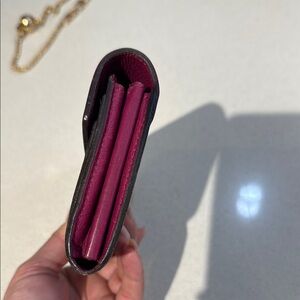 Elegant Louis Vuitton wallet in pink and brown. Features signature monogram design with a stylish gold clasp. Perfect for adding a touch of luxury to your everyday essentials.