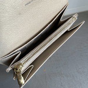 Circa 2011, the Pochette Solo pouch from Louis Vuitton is made in a Damier Azur coated canvas, and features gold-tone brass hardware, a back loop to slide a belt through, a front flap secured with a branded-snap closure, a patch pocket under the flap, an accordion-style interior with a zipper pocket divider, and a back slip pocket.