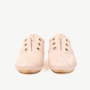 The Popincourt sneakers from Louis Vuitton are crafted with a monogram-embossed nubuck leather in a Rose Poudre pink, and feature closed almond toes, grommet detailing, a logo on the tongues, and rubber outsoles.