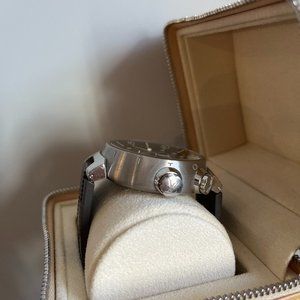 Condition: Very good; light scratching on crystal, light scratching on steel hardware. Comes with information booklet, case, and box. Watch comes as-is.