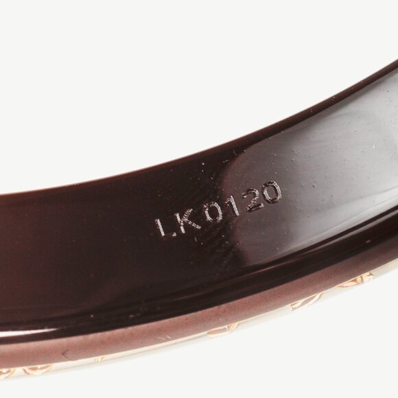 The slip-on Narrow Inclusion bangle from Louis Vuitton is made in a brown resin; and features gold-tone monogram charms, flowers, and crystals embellished throughout.