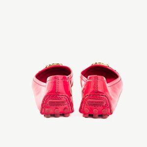 Made in Italy, these ballet flats from Louis Vuitton circa 2009 are crafted with a glossy patent calf leather in a Rose Pop pink, and feature closed rounded toes, bands over the vamps with gold-tone LV monogram accessories, smooth leather lining, exceptionally comfortable padded insoles, and pebbled rubber driving shoe outsoles.