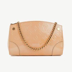 Circa 2015, this France-made Santa Monica clutch from Louis Vuitton is crafted with the designer's embossed Monogram Vernis patent leather in a Dune nude, and features gold-tone hardware, a chain shoulder strap with a lobster clasp on one end, logo-engraved nail heads and flat leather corners to subtly evoke historic Vuitton trunks, a top zip closure, and a tonal textile-lined interior containing a slip pocket.