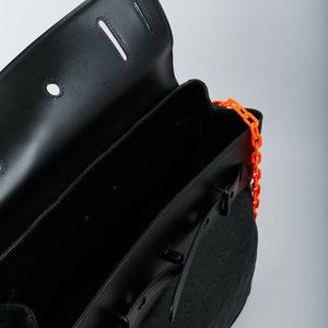 Crafted of monogram embossed calfskin leather in matte black, the Streamer PM is modern take on the original 1901 Streamer bag. Designed by Virgil Abloh for the Spring/Summer 2019 collection, this luxuriously designed messenger bag is the can be carried by its single top handle or by its adjustable and detachable cross-body strap. The smooth leather trimmings and the black-toned hardware perfectly compliment the monogramed embossed leather. With a unique strap-and-pin closure attached by a statement neon orange chain, the Streamer PM opens to reveal a spacious black fabric interior with three flat pockets. This bag also features a posterior outside zip pocket for easy access to your essentials.