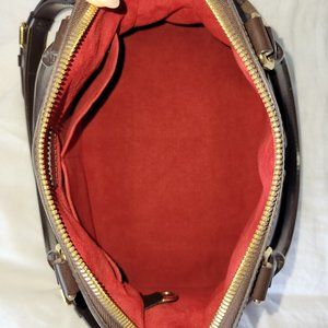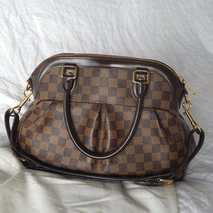 Brown and tobacco Damier Ebene coated canvas Louis Vuitton Trevi PM with brass hardware, dual rolled top handles, detachable shoulder strap included, chocolate leather trim, crimson Alcantara lining, dual slip pockets at interior wall and zip closure at top.