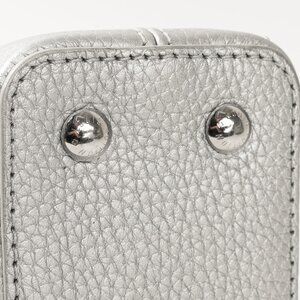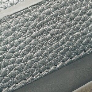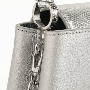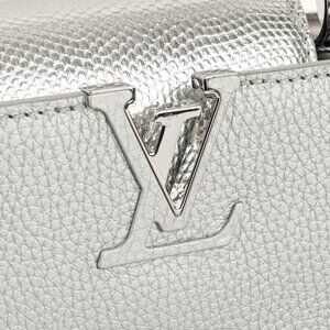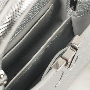 Expertly crafted from the finest materials, the Louis Vuitton Varanus Salvator Lizard Flower Chain Capucines Mini Silver is an exquisite statement piece. With a metallic calfskin and lizard leather design, it features a reinforced top handle, detachable silver-toned shoulder strap bearing Vuitton's iconic monogram flowers, silver-toned metal feet, and a prominent LV logo in centre for the most opulent touch.