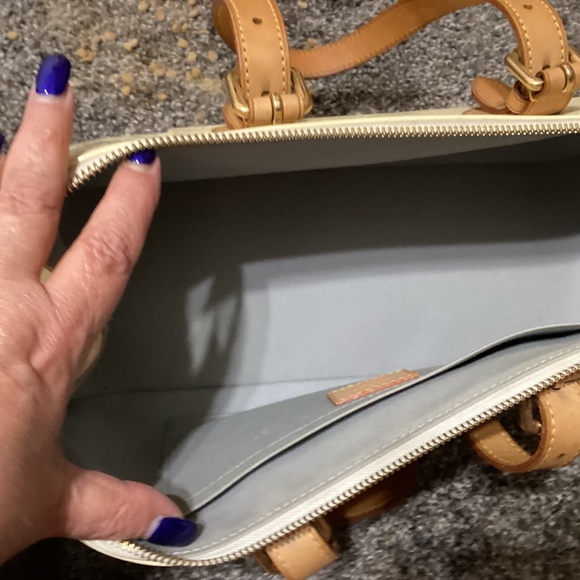 This is an authentic LOUIS VUITTON Vernis Rosewood Ave in Perle. This tote is crafted of Louis Vuitton monogram-embossed vernis patent leather. The bag features vachetta leather trim and an adjustable shoulder straps with gusseted sides with a zipper top closure that wraps down one side to easily open wide. It is lined in fabric with an interior patch pocket. Length 13 " x Width 6" x height 6"