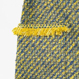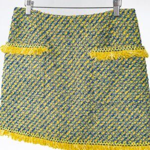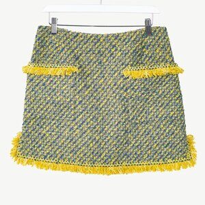 Made in France, this skirt from Louis Vuitton is crafted in a yellow and blue cotton-blend tweed, and features front patch pockets, a mini-length hem, side slits, fringed trim, a back zip closure, and is lined in a champagne silk.
