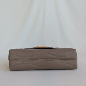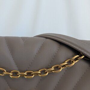 This is an authentic LOUIS VUITTON Calfskin LV New Wave Chain Bag in Taupe. This chic bag is crafted of quilted calfskin leather in beige. The bag features an aged gold chain strap with a leather shoulder pad and gold LV logo on the front. The bag opens to a matching microfiber interior with a zipper compartment and patch pocket.