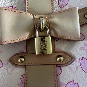 A replica of the Louis Vuitton Cherry Blossom Monogram Pink Sac Retro Purse by Takashi Murakami. Good used condition, some staining and scuffing to inside lining. No key or leather tag included. 8" high x 11" wide. Suede interior. The Limited Edition Cherry Blossom Sac Retro is from the Spring/Summer 2003 Collection.