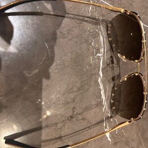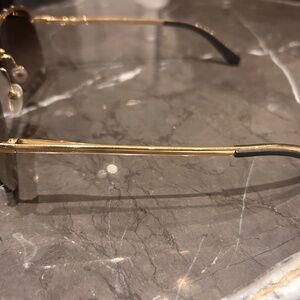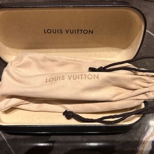 These Louis Vuitton sunglasses have an aviator shape with stylish embellishments on the lenses. They look gorgeous on and are in excellent condition. Includes original brown leather glasses case and pouch.