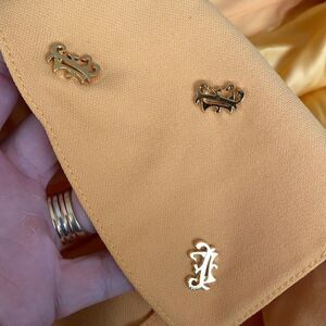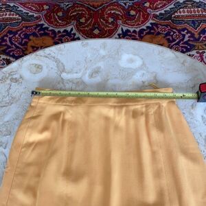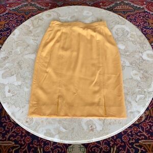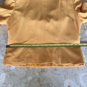 Stunning yellow colour, feminine short sleeve jacket with light shoulder pads and gorgeous gold tone metal LF logo embellishments on jacket collar and cuffs. Matching slits on jacket and skirt (2 in front and 1 in back). This is such a cool and elegant vintage set!! Both jacket and skirt are fully lined.