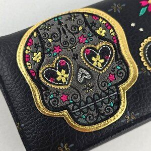 Excellent pre-owned condition, Loungefly Sugar Skull Day of the Day black trifold faux leather wallet with gold-tone interior.
