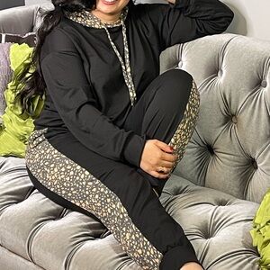 A solid knit matching two piece loungewear set with long sleeve round neck hoodie and pants featuring a cheetah print trim. Fabric is soft and comfortable.