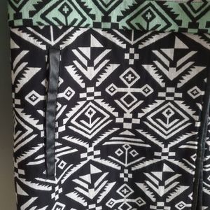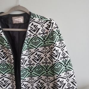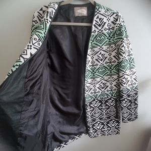 This is a gorgeous jacket with black, white, and mint green accents. It even has pockets! It would be great for the office or for dressing up an outfit for dinner. The jacket is also in phenomenal condition.