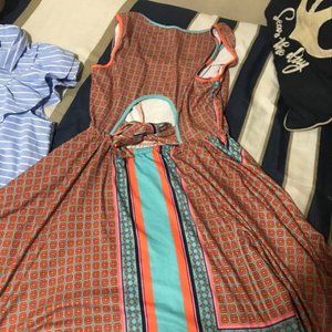 Has pretty orange and blue designs. Sadly it doesn't fit me properly.