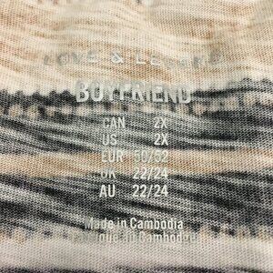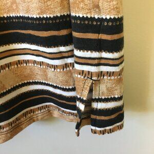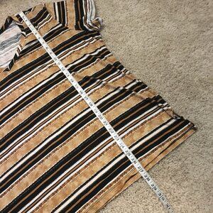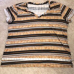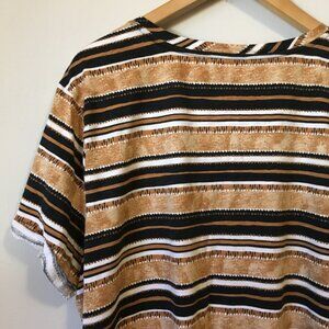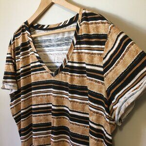Very good preowned condition, rolled short sleeve cuff, horizontal striped, V-neck Boyfriend fit tee by Love & Legend. Fabric is lightweight, soft and comfortable. Colours are rustic and eclectic in a range of browns, roans, tan, black and white.