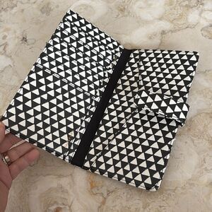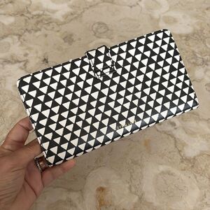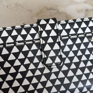 Handy large travel wallet from Love & Lore. Made of vegan leather in a striking black and white op art design.