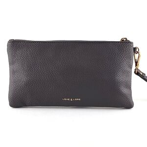 Excellent pre-owned condition, Love & Lore wristlet clutch in a dark grey pebbled faux leather with a top zip closure and front slip pocket with clasp. Features a top zip closure, detachable wrist strap and gold-tone hardware.