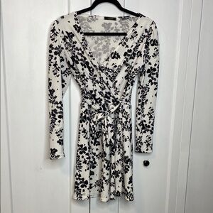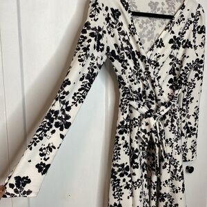 Elegant floral wrap dress in black and white. Perfect for any occasion with its stylish design.