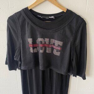 Super cool and comfy Love Moschino midi dress. Black with a layered cropped netted cropped tank and bold "LOVE" graphic with scattered gems. Easy to wear, stylish, and perfect for casual days. The material tag in cut - Excellent pre-owned condition.