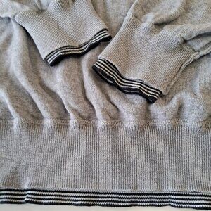 There's a gray and black striped fabric detail at the cuffs and hem (giving the impression of a layered sweater).