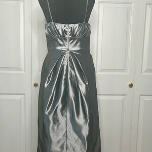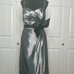 This beautiful Love gunmetal dress is satin and a size 10. This dress was worn at a movie premiere in Los Angeles by the actress Maggie Grace! It has spaghetti straps, but the straps can be removed to make this dress strapless. The sweetheart neckline has a ruched bust. The dress has a banded waistline, that can be accentuated by a beautiful detachable black belt. The band around the waist creates a flattering waistline. The skirt is slightly ruched on one side as well as in the back. This dress hits at, or slightly below, the knee, depending on the height of the person wearing it. The satin fabric adds a beautiful shine to this dress. This dress is perfect for parties, weddings, and glam nights out. It has a sewn in bra. It was worn once and it is in pristine condition.
