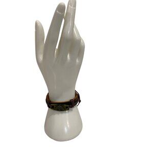 This bracelet combines a love sign with Cupid's bow design, crafted in brown leather. It is adjustable, offering a comfortable fit for various wrist sizes.