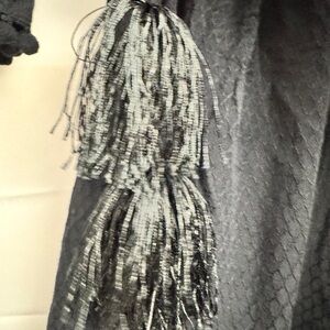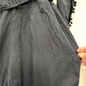 This stunning jumpsuit combines bohemian charm with modern sophistication, featuring intricate crochet lace detailing on the wrap-style bodice and flowing bell sleeves. The playful pom pom trim on the sleeves adds a unique, whimsical touch, while the waist closure with tassel ties ensures a flattering, adjustable fit.