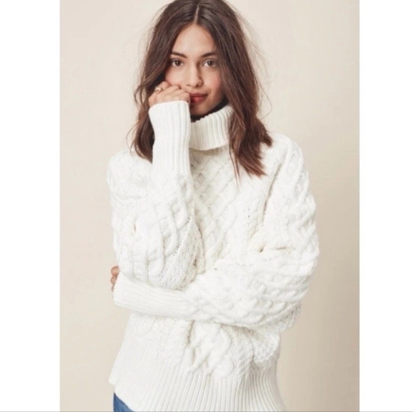 Elegant ivory turtleneck with intricate cable knit design. Soft and warm for chilly days.