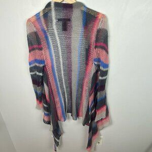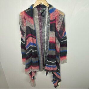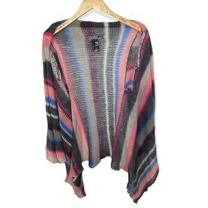 Love Stitch Mohair Blend Open Knit Cardigan in Pink, Grey and Blue. Womens size small. 30% mohair, 30% nylon and 40% acrylic. Bright stripes on this draped waterfall sweater are perfect all year round. Oversized fit. Lightweight but warm. Model photos for different colour to show fit. Very good pre-loved condition. No visible flaws.