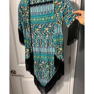 Love Tease Blue Tribal Print Fringe Kimono Robe XS – Boho Festival Beach Cover-U