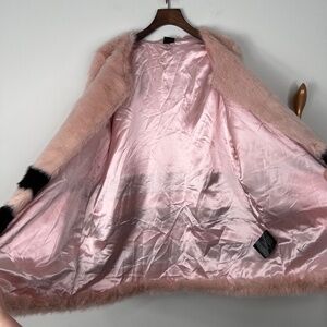 Chic faux fur coat by Love Token. Soft pink with bold black stripes. Perfect for stylish warmth.