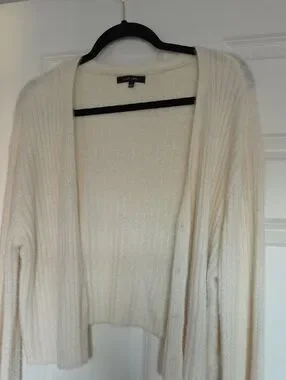 LOFT cream ribbed open-front cardigan. Lightweight knit with vertical rib texture. Relaxed silhouette for layering. Neutral tone pairs with many outfits.