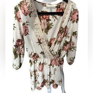Charming Romper with floral design. Features pink and green flowers. Delicate lace trim adds elegance. Excellent condition