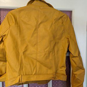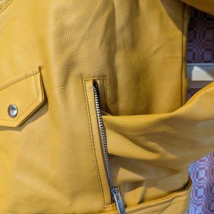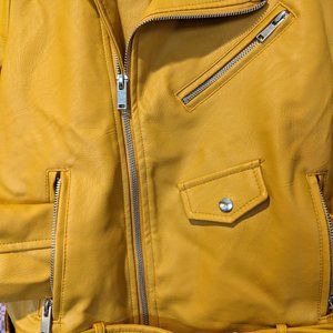 Vegan leather motorcycle style jacket with belted waist. Two side zip pockets. One left breast sit pocket and offset zipper.