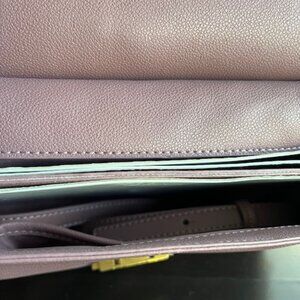 Size 12” x 9” x 5”. Color: Rose pink with gold tone hardware. Material outer 100% polyurethane, lining 100% polyester. Handles 11”. Shoulder strap 45” included. NWT.
