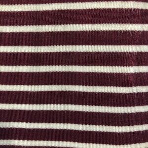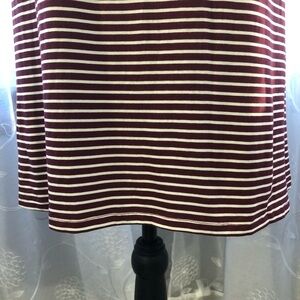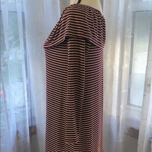 Purchase this brand new, without tags, cute knee length/above the knee off the shoulder dress. Pattern is striped with burgundy and white coloring, great for fall, spring or summer. Approximate measurements from top to bottom 30 inches and waist area 22 inches. Material is stretchy! 95% rayon and 5% spandex.