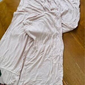 Piped PJ set. Top is a button up with a collar and front breast pocket. Bottoms have an elastic waist and drawstring.