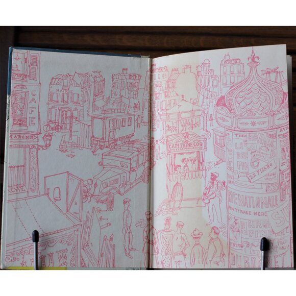 This is "Love of Seven Dolls" by acclaimed American novelist, Paul Gallico, author of the Poseidon Adventure and the Mrs. Harris books. It was published by Micheal Joseph Ltd. in 1954. This copy is a sixth impression of the first edition, printed in 1957. It has a colorful pictorial hardbound cover with blue lettering on the spine. It also has its equally colorful pictorial dustjacket that is worn, foxed and somewhat tattered around the edges.