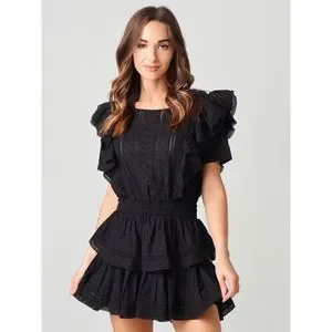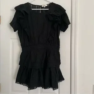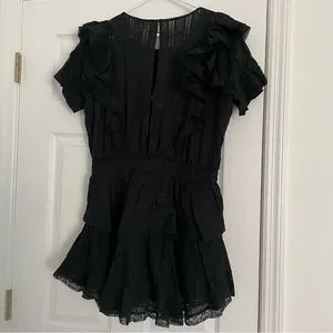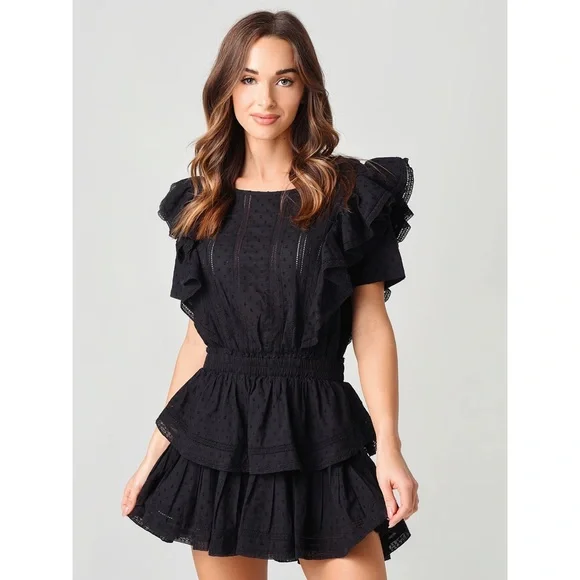 Chic black mini dress. Features ruffle details. Perfect for any occasion.