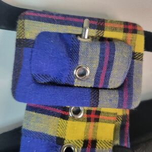 Unusual streetwear style Korean 3 quarter length sleeve tee shirt with plaid adjustable soft belt shoulder strap. Unknown sizing, please refer to measurements. Feels like good heavyweight cotton. One sleeve is a couple of inches longer in length than the other, asymetric look.