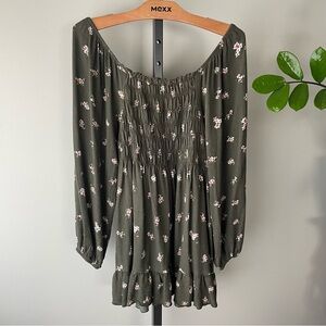 Lovely Melody Off Shoulder Floral Smocked Long Sleeve Green Mini Dress
