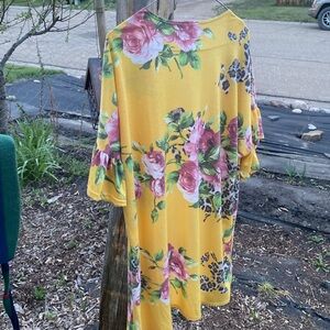 Embrace a relaxed and feminine style with this Lovely Melody blouse, featuring flutter sleeves and a vibrant pink and yellow floral design, also has animal print.. The boxy silhouette and airy fabric make it perfect for warm weather, offering both comfort and elegance.no size tag, no belt, just hangs nicely over a summer outfit.